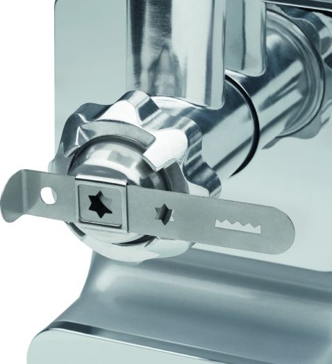 🔩 3 Edelstahl-Lochscheiben (7/5/3 mm) – Bietet feine, mittlere oder grobe Strukturen für vielseitige Anwendungen wie Würste, Frikadellen und Pasteten.