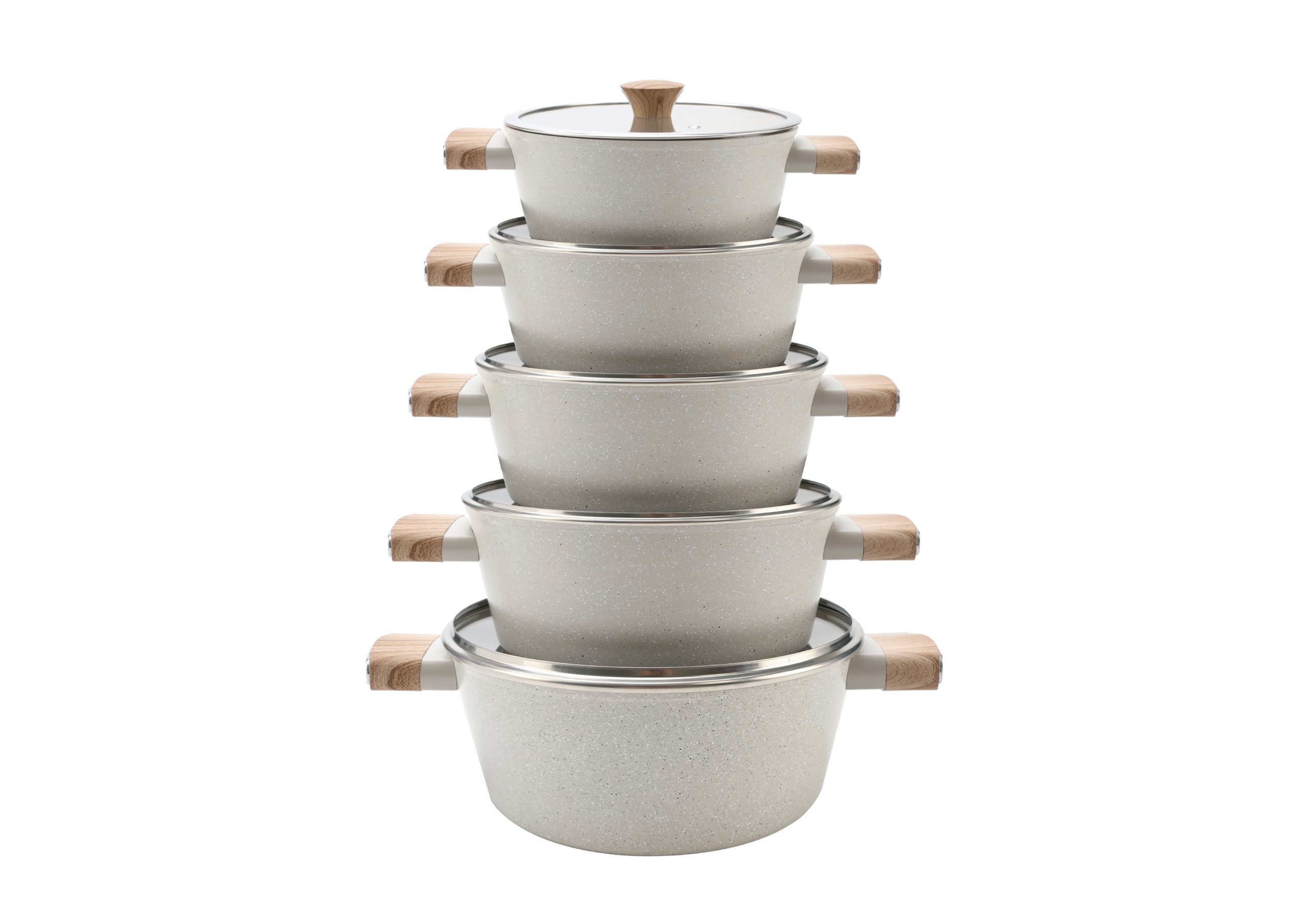 Bring a touch of sophistication to your kitchen with this 10-piece cookware set, designed to combine style, durability, and outstanding performance. Featuring a modern stone-effect design available in beige, black, and gray, this set is as functional as it is stylish.